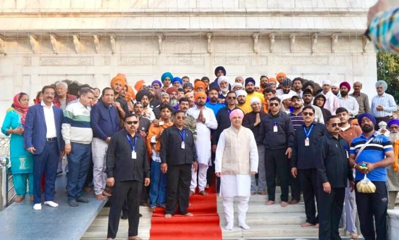 देहरादून। पंजाब के विभिन्न हिस्सों से 150 सदस्यीय पैदल संगत का जत्था आज शाम को श्री दरबार साहिब पहुंचा। शाम 5ः00 बजे दरबार साहिब देहरादून के दर्शनी गेट पहुंचते ही पैदल संगत का पुष्प वर्षा व ढोल नगाड़ों की थाप के साथ दूनवासियों व दरबार गुरु राम राय महाराज, प्रबन्ध समिति एवम् झंडा मेला आयोजन समिति ने जोरदार स्वागत किया। दर्शनी गेट व दरबार साहिब परिसर में दरबार साहिब के सज्जादानशीन श्रीमहंत देवेन्द्र दास महाराज की अगुवाई में पुष्प वर्षा के बीच संगत का जोरदार स्वागत हुआ। महाराज ने संगत को दर्शन दिए व आशीर्वाद दिया। दरबार साहिब परिसर व निकटवर्ती समूचा क्षेत्र गुरु राम राय महाराज के गगनभेदी जयकारों से गूंज उठा।
