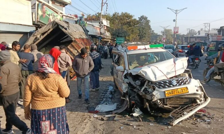 अनियंत्रित ट्रक ने कई वाहनों को मारी टक्कर, दुकानों में घुसकर पलटा